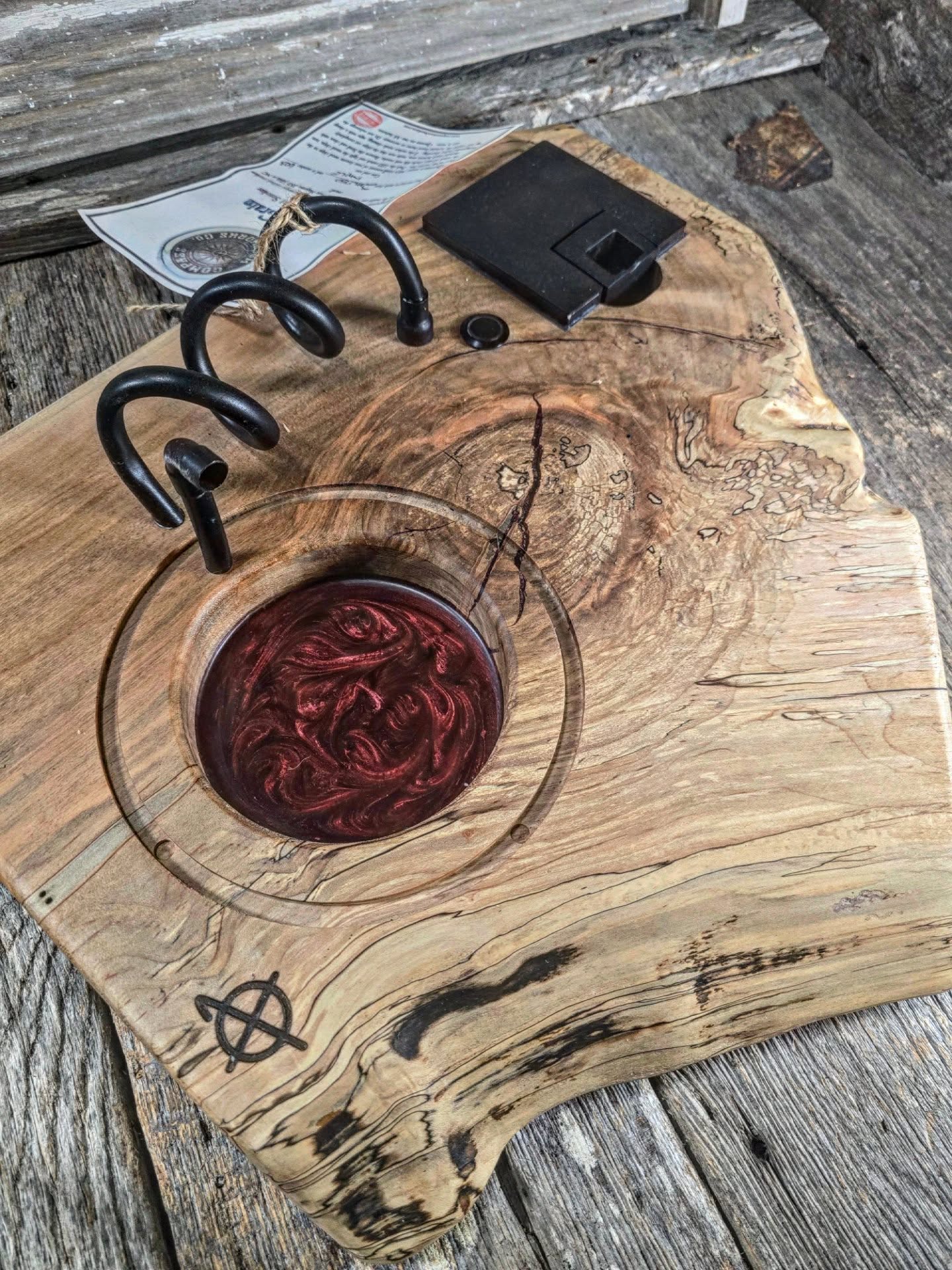 Spalted maple Infused Grain Cocktail Smoker with black textured hardware and ruby metallic epoxy.