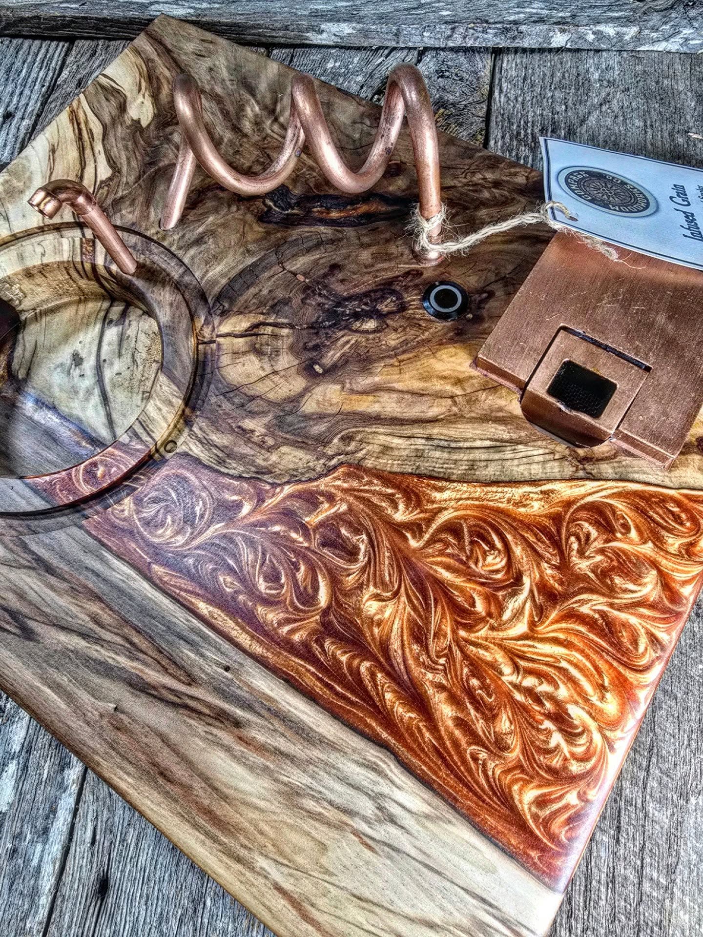Stunning sweet gum knot Infused Grain Cocktail Smoker with copper epoxy river and paired with copper hardware.