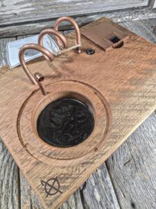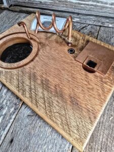 A unique opportunity to have an Infused Grain made from circular sawn oak that was milled near the turn of the century at the historic Shuping Mill that was located in Rockwell, NC. The mill burned in the late 80’s but I salvaged an old barn an out building that was located on the property where the mill stood. The piece is made to highlight the wood but still shows the milling marks. Paired with a metallic black/copper epoxy and copper hardware.